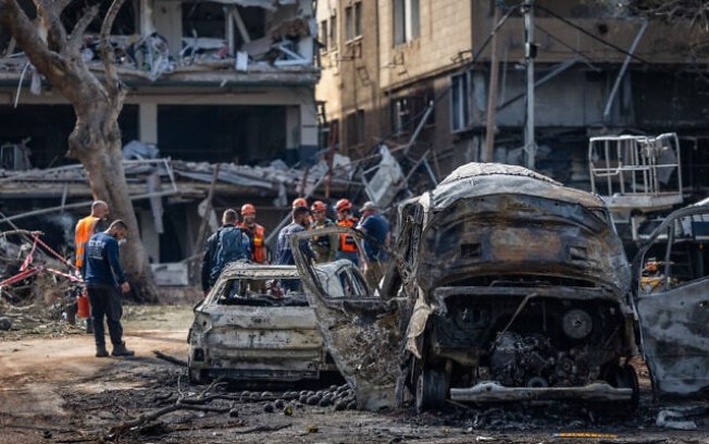 Forças de segurança e resgate israelenses em Tel Aviv, após ser atingido por um míssil balísticoReprodução/The Times of Israel